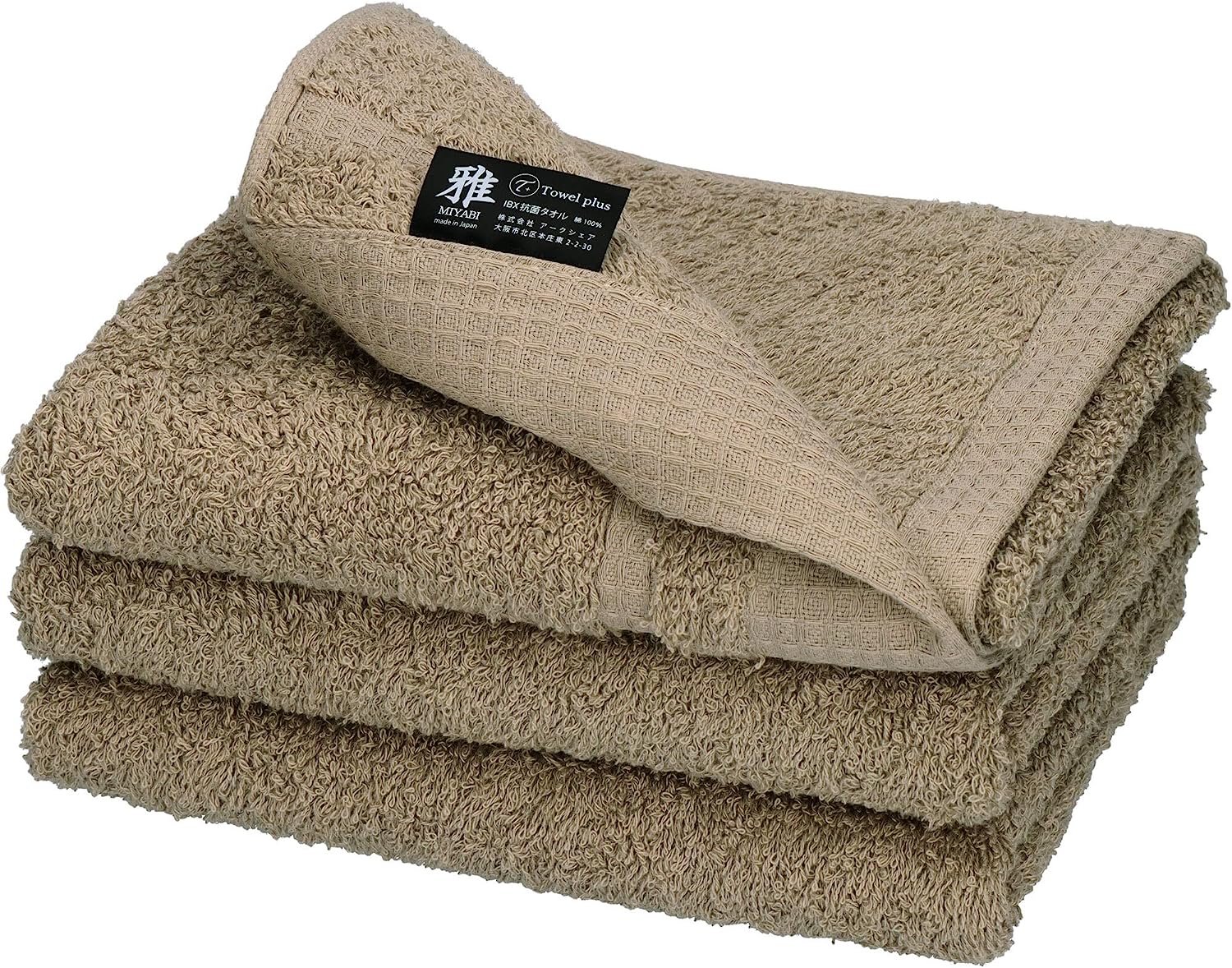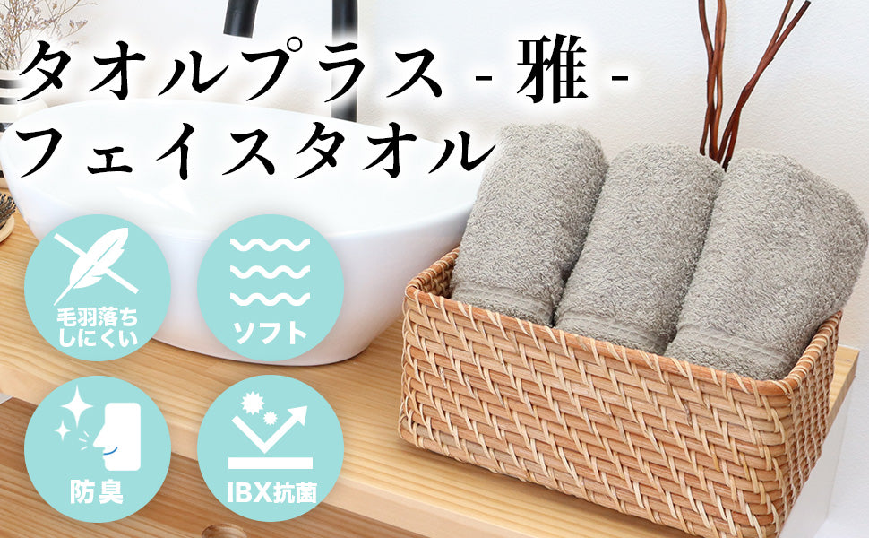- 【 商品仕様 】:タオルプラス -雅-(MIYABI)サイズ:80x34cm。数量:3枚。素材:綿100%。重量:109g(1枚あたり)。セット内容:グレージュ3枚。